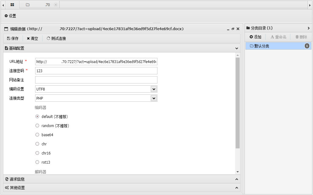 用蚁剑去连接,地址为/?act=<word上传的地址>。