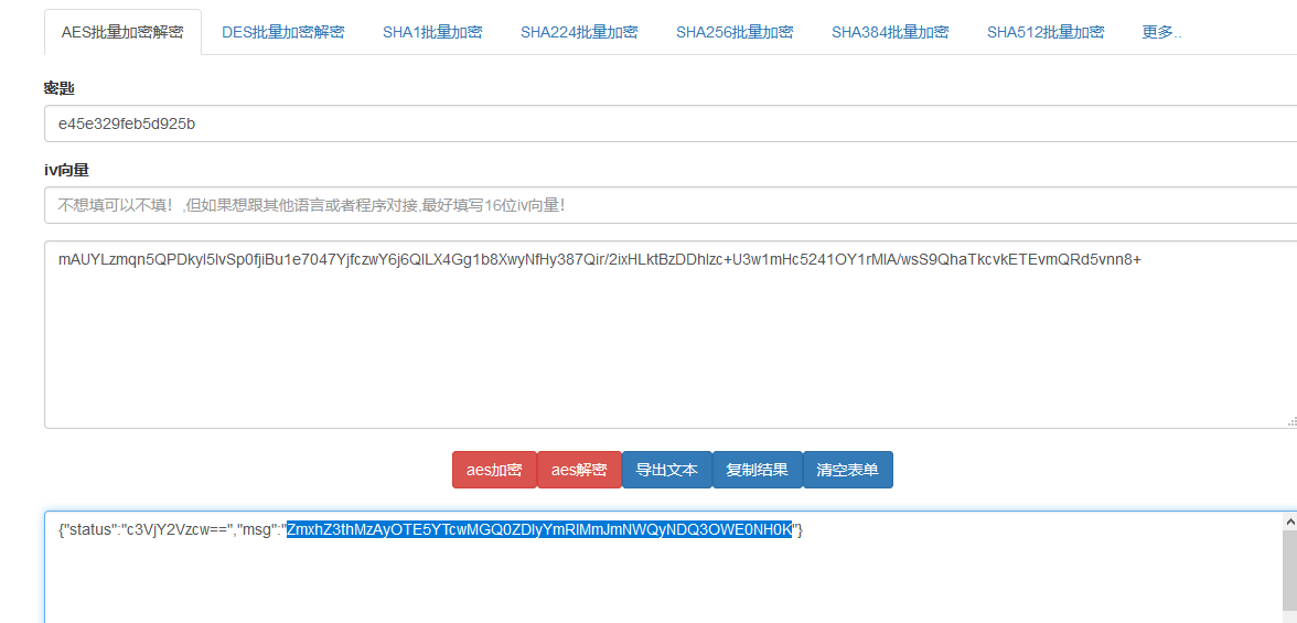 用里面的默认key,对刚才流量中选中的部分做AES解码,可以得到下面那串东西:{"status":"c3VjY2Vzcw==","msg":"ZmxhZ3thMzAyOTE5YTcwMGQ0ZDIyYmRlMmJmNWQyNDQ3OWE0NH0K"}