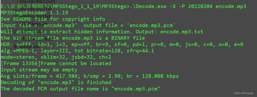 .Decode.exe -X -P 20220204 encode.mp3 -X 是提取隐藏文件 -P 是密码 20220204 为文件隐藏时的密码 encode.mp3 是要提取的文件 |