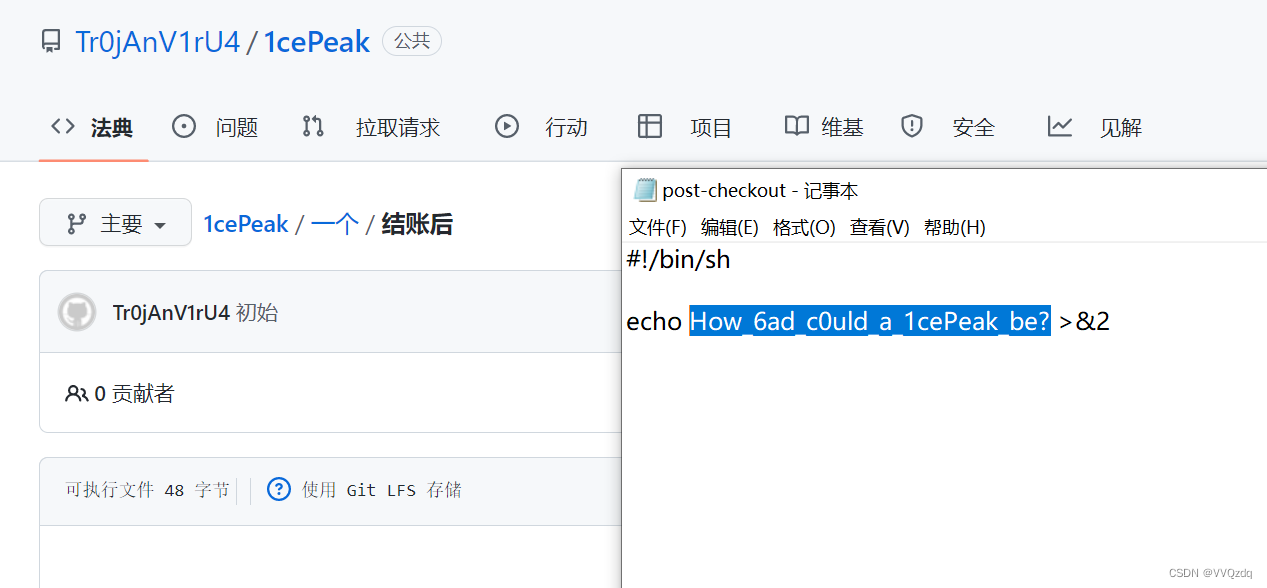 | 在github 上找到该项目 密钥在post-checkout里面 1cePeak/post-checkout at main · Tr0jAnV1rU4/1cePeak · GitHub