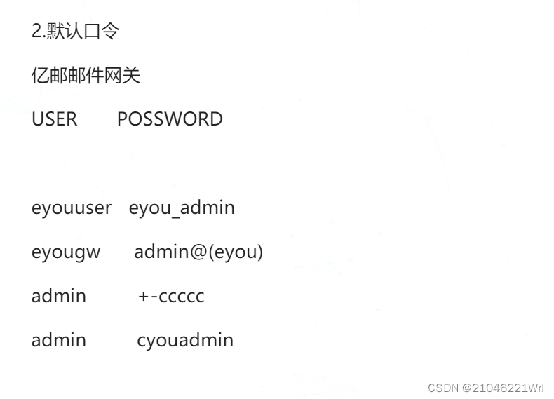 因为这里存在验证码,因此无法爆破,只能另辟蹊径,在网上查了半天,找到了一些亿邮邮件网关的默认口令,但七零八碎的,最后找到了一个综合的默认口令集,链接放在这里