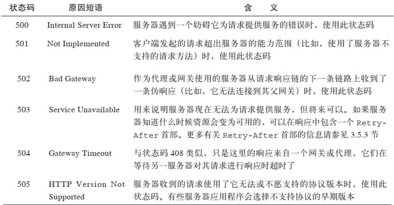 有时客户端发送了一条有效请求, 服务器自身却出错了。 这可能是客户端碰上了服务器的缺陷, 或者服务器上的子元素, 比如某个网关资源, 出了错。代理尝试着代表客户端与服务器进行交流时, 经常会出现问题。