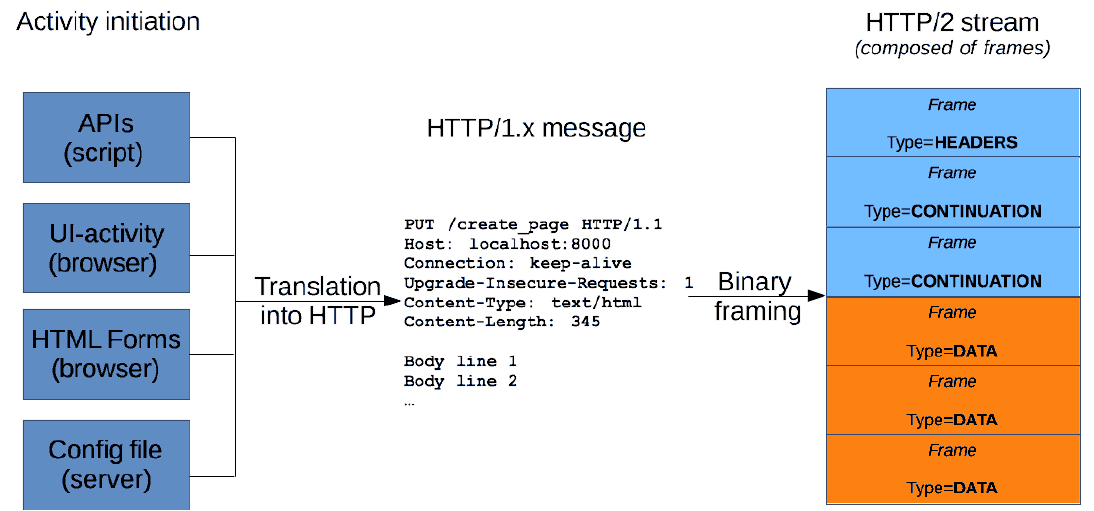 (4)HTTP消息由采用ASCII编码的多行文本构成。在HTTP/1.1及早期版本中,这些消息通过连接公开地发送。在HTTP/2中,为了优化和性能方面的改进,曾经可人工阅读的消息被分到多个HTTP帧中。