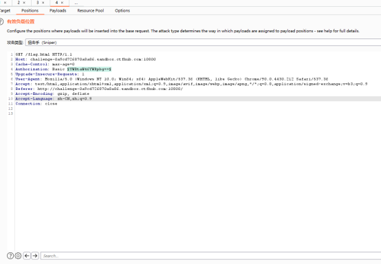 把抓到的包发送到爆破模块intruder。选择刚才的base64字符串,记住,不要吧basic选上了。选择狙击手。点击payloads。