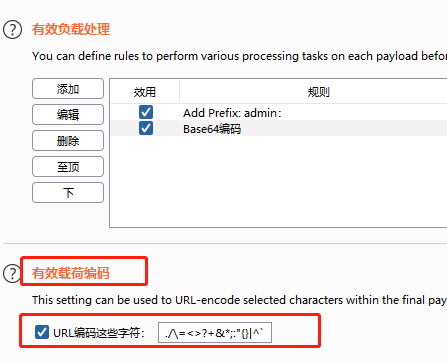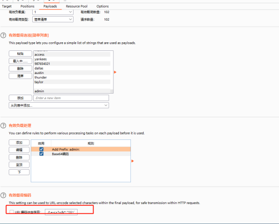这里又常规的爆破选项,导入密码本。但是切记,因为密码和用户名是base64加密的,所以有效载荷处理这里要手动处理一下。