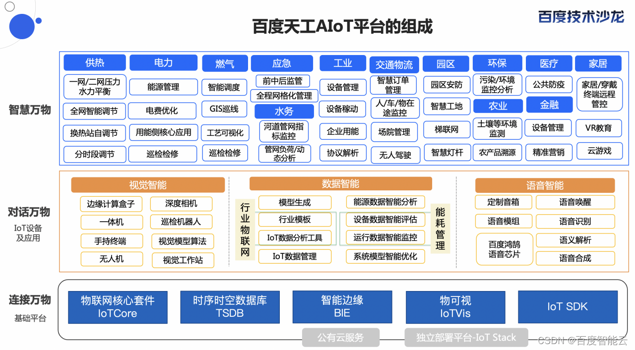 视觉智能与百度视觉部门深度合作,提供了视觉一体终端设备、深度相机、巡检机器人等一系列视觉中间件;数据智能可以帮助大家获取各种数据分析模型,比如能源数据分析模型、设备分析模型、运行数据分析模型以及技术优化等,同时我们也提供创建新的模型训练平台,可以将物联网原始数据进行整理和分析,获取到一些高级策略;语音智能提供了鸿鹄的高级语音芯片,帮助我们直接构建智能的终端设备。基于这些中间件设备,我们在供热、电力、燃气、应急、工业、物流、园区、环保、医疗、家居等各场景中都提供了综合的服务方案。