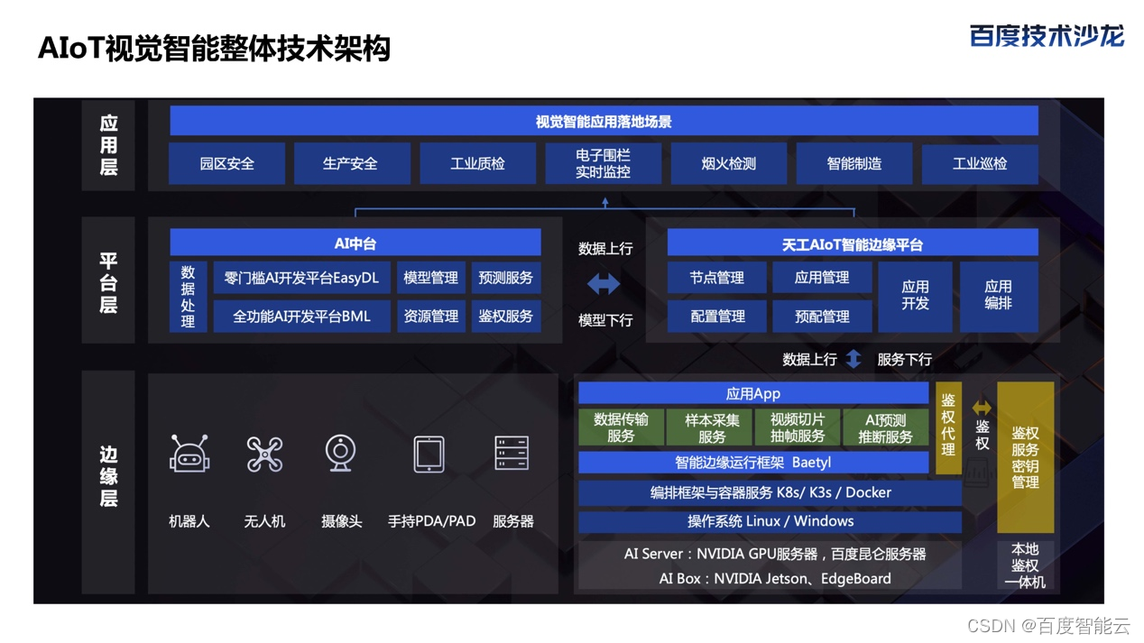 徐伟还针对 AIoT 视觉智能整体技术架构做了介绍,百度提供面向不同用户的 AI 开发平台,EasyDL 是零门槛 AI 开发平台,平台可以覆盖图像、视频、文本、语音、OCR、结构化数据、商品检测等七大方向的数据来源,通过零代码的交互方式,能够产出可以部署在公有云、设备端SDK、软硬一体和本地服务器等多种不同方式下的灵活的部署包;BML 是面向算法工程师的全功能 AI 开发平台,提供了从数据采集、数据清洗、数据扩充、数据标注、模型构建到模型管理、云端及离线推理服务管理等 AI 开发过程的全生命周期管理功能。在完成模型开发以后,百度提供的 EasyEdge 模型转化工具可以让云端模型适配边缘异构设备,最终通过百度天工AIoT智能边缘平台的应用管理、应用编排和应用部署能力来打通视觉智能交付的最后一公里。