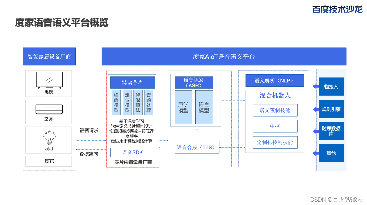 百度智能云物联网产品经理杜凯介绍了度家语音语义平台架构采用了端到端的设计分为鸿鹄芯片、语音技术以及语义解析三部分,同时,度家平台也会接入百度天工AIoT平台进行设备管理和数据处理。