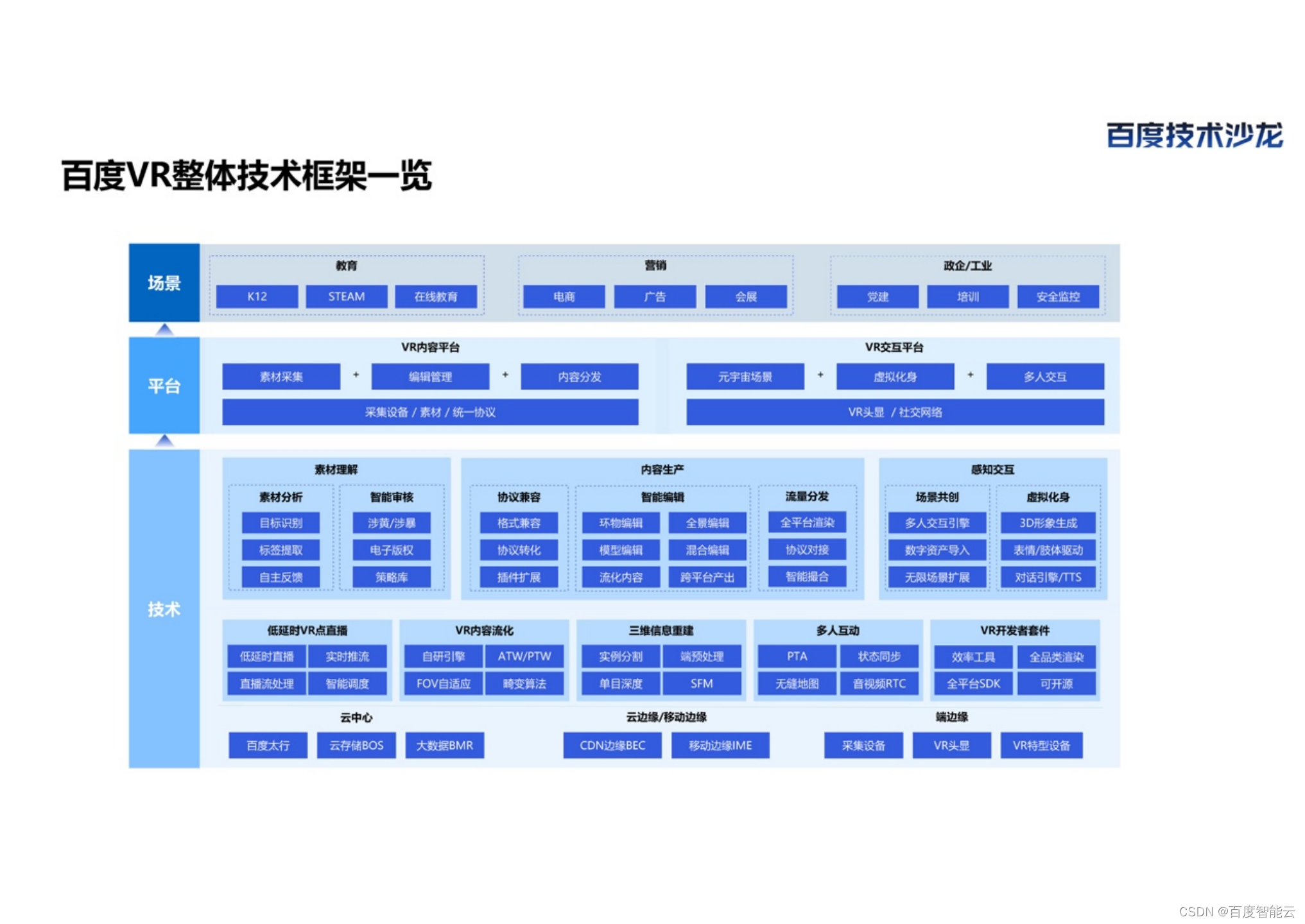 虚拟现实产业的本质是 VR 内容的生产和消费。基于此,虚拟现实的三大核心技术包括数据三维化、交互多人化以及渲染云端化。在这个业务模式下,柴学智还介绍了百度VR整体技术框架的三个显著特点:首先是能力开放,VR 整体技术架构背靠百度智能云与百度大脑,在点直播、云 VR、多人互动、三维重建、VR 编辑、内容交互场景下,有着行业领先的技术积累;其次是平台通用,我们夯实了 VR 内容平台的全平台属性,让 VR 内容的生产更加便利高效,让VR内容的消费通路更加顺畅;最后是场景丰富,依靠丰富的产品矩阵和深厚的技术沉淀,百度 VR 团队在教育、营销、政企、工业等诸多方向,为电商、广告、会展、党建等场景扩展了新的价值与用户体验。