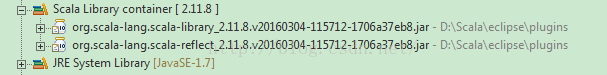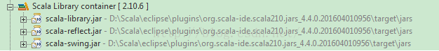 需要注意的是,由于Scala版本的不同, Scala缺省引用的类库也有所不同,例如当选择Eclipse自带的Scala 2.10.6版本时,swing类库是自动引