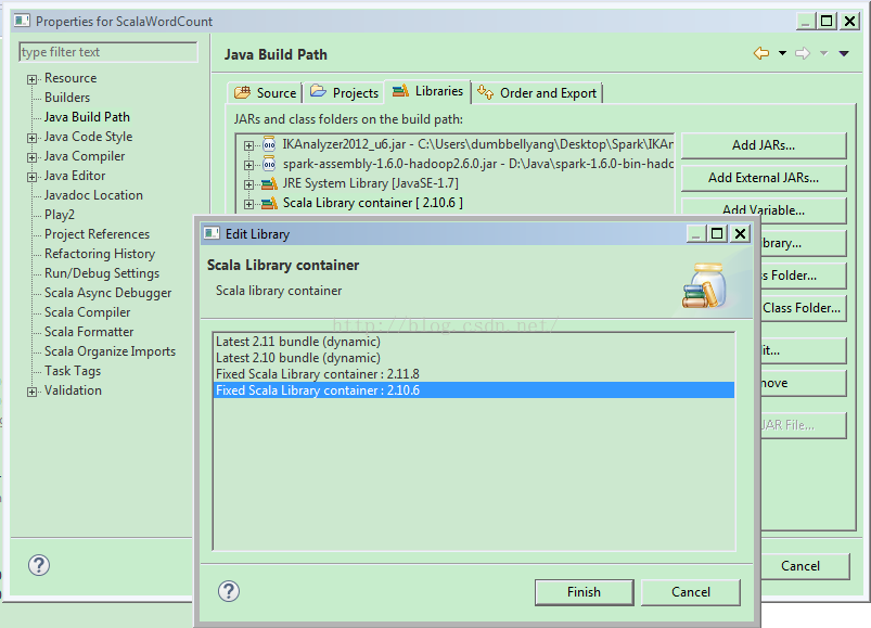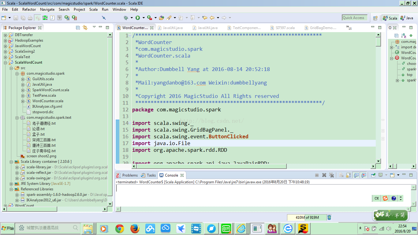 整个工程结构很简单,Text包中和Java工程中一样,包含了内置的文本文件。整个工程引用的类库和Java工程类似,只是多了Scala的内容。