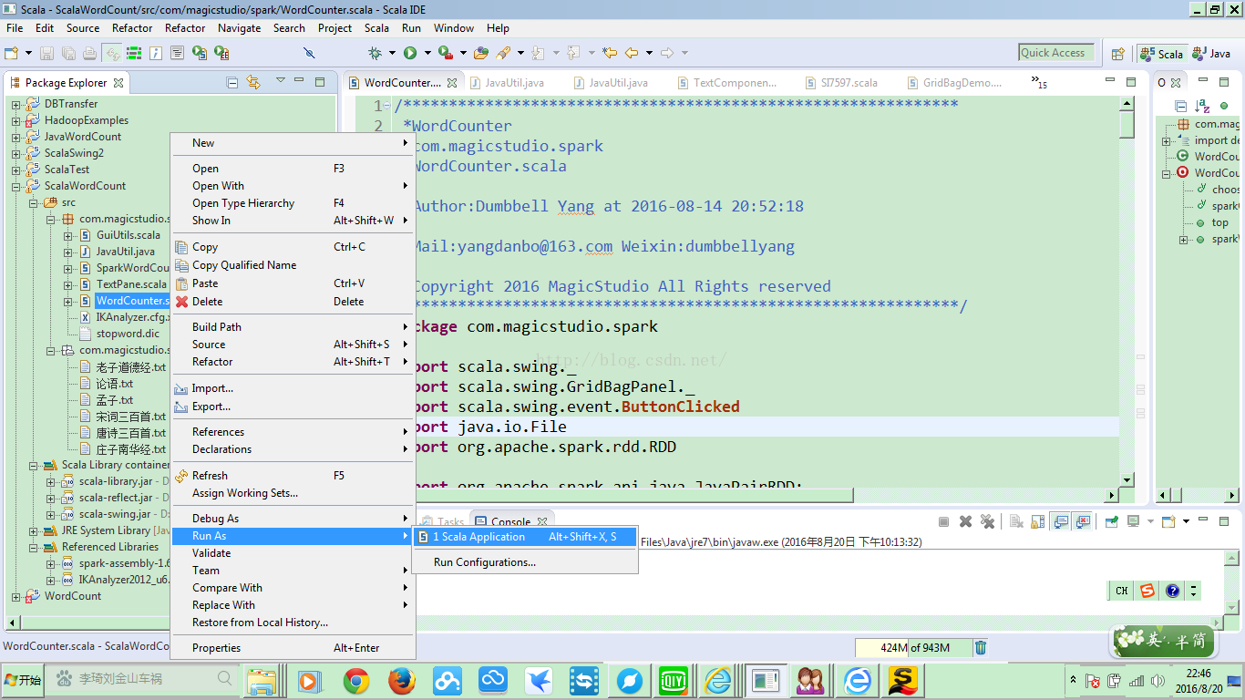 当你在工程主类文件WordCounter.scala上单击右键,选择Run As Scala Application: