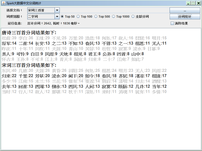 然后选择唐诗宋词进行分词统计,就会出现前面显示的分词结果。