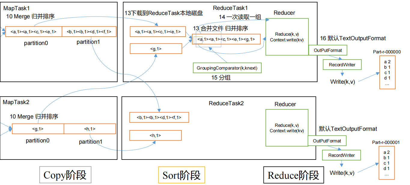 (2)Sort 阶段:在远程拷贝数据的同时,ReduceTask 启动了两个后台线程对内存和磁盘上的文件进行合并,以防止内存使用过多或磁盘上文件过多。按照 MapReduce 语义,用户编写 reduce()函数输入数据是按 key 进行聚集的一组数据。为了将 key 相同的数据聚在一起,Hadoop 采用了基于排序的策略。由于各个 MapTask 已经实现对自己的处理结果进行了局部排序,因此,ReduceTask 只需对所有数据进行一次归并排序即可。
