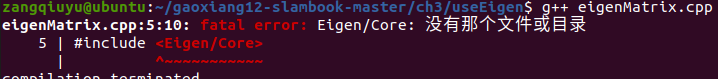 1.eigen3相关程序编译不通过,显示找不到eigen3头文件,使用软连接sudo ln -s /usr/include/eigen3/Eigen /usr/include/Eigen链接到eign3头文件,编译时若依然未通过,则在cmake中加入eigen3绝对路径。若编译报错但通过,则不用理会。