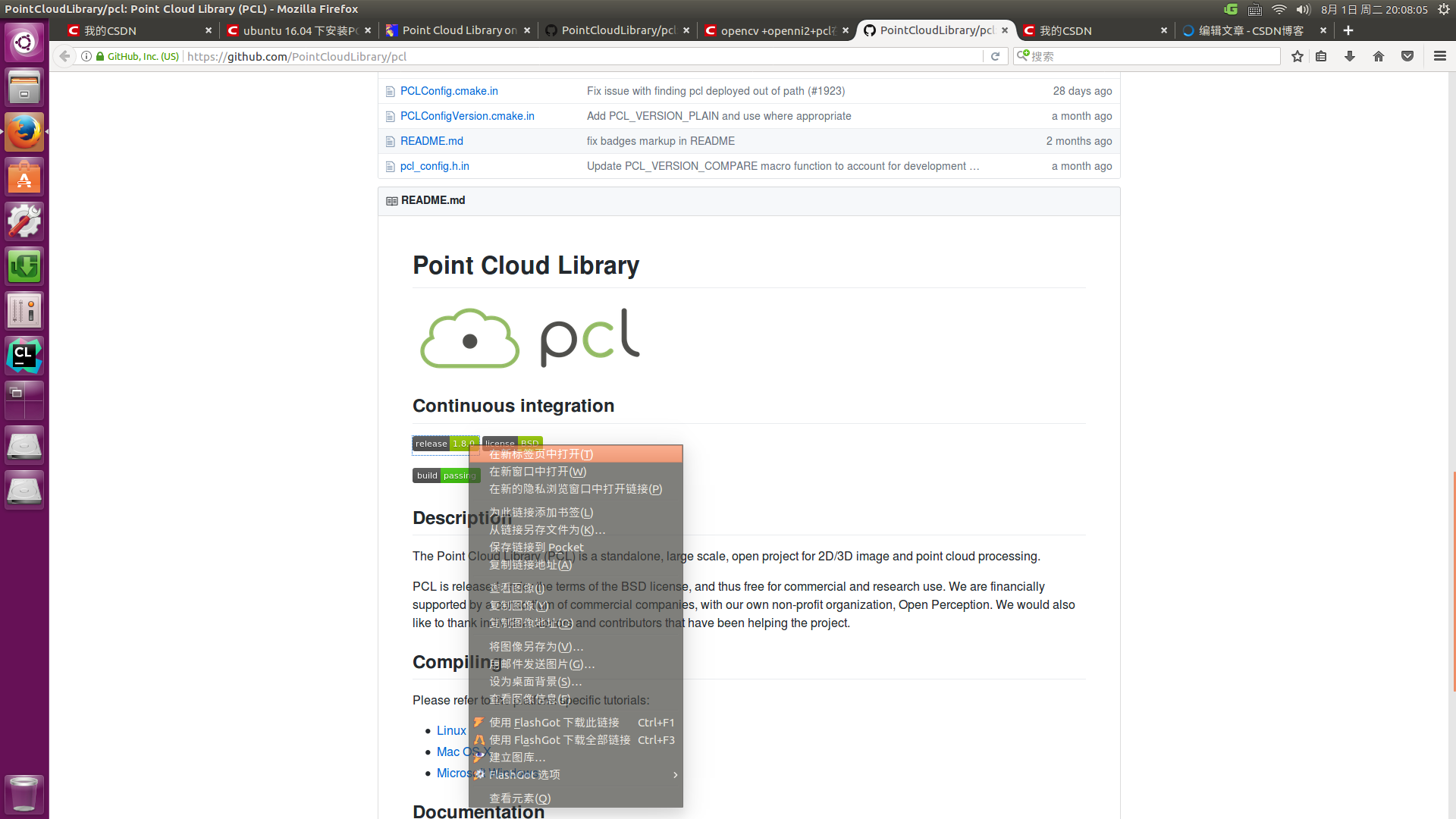 而找到了多个pcl的源代码压缩文件,我个人选择了pcl1.8.0的source code (tar.gz)——(如下图所示),解压之后就得到了pcl的源代码