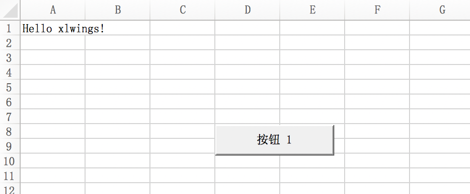 点击按钮1,A1单元格出现内容Hello xlwings!。
