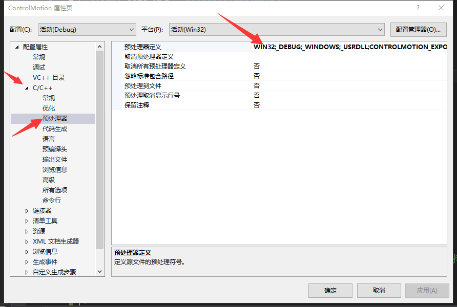 进入动态库属性页,选择C/C++>>预处理器>>预处理器定义,将上一步所设定的TEST_Dll_EXPORT添加进去