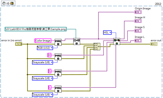 先说明一下它的使用方式,它的使用方式很简单,首先要将我们的彩色图像接在Image Src上面,再来选择我们要解析彩色图像的方式,LabVIEW所提供的这个function有四种Color Mode,就是我在前一节所介绍到的RGB、HSL、HSV和HSI,接着再接上自行创建的三个灰阶(8bits)的影像空间,做为输出结果存放的地方, 这样大致上就完成了,完成的程序码如下图3-6所示,程序执行的结果如下图3-7所示。在图3-7中我们可以看到右上角那张为色相的灰阶解析图,我们可以 看到原图中黄色的部分,在这张图里表现出来的灰阶值都是差不多的,因为他们几乎是属于相同的色相,就是平常我们口中的黄色;左下角那张为饱和度的灰阶解析 图,我们可以看到原图中越纯的颜色,表现出来的灰阶值越高;右下角那张为亮度的灰阶解析图,我们可以看到原图中亮度较高的部分,在这张灰阶解析图中所表现 出来的灰阶值越高。