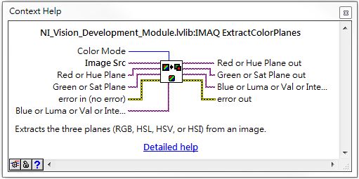今天第一个要介绍的工具是IMAQ ExtractColorPlanes,如下图3-5所示。它的功能是把一张彩色图像依据我们想要解析的方式,将其拆解为三张灰阶图像,每一个灰阶图像分 别代表RGB(HSL, HSV, HSI)中的R(H), G(S)和B(L, V, I),每一个像素的灰阶值为0~255。