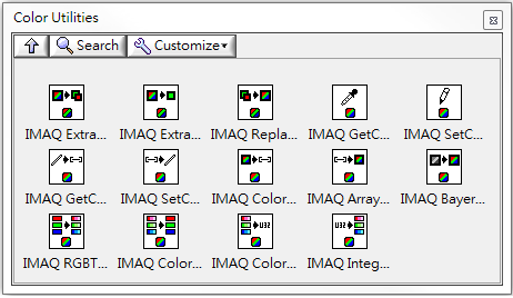 相信经过了前面小节的说明,大家已经了解什么是色彩空间,而彩色图像又是如何构成的了,接下来作者就来介绍这一章的重头戏,LabVIEW中的色彩解析工具,如下图3-4所示。