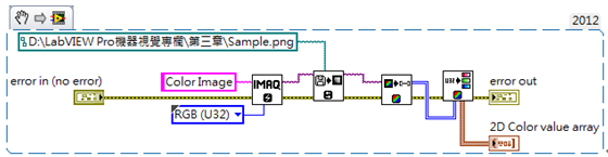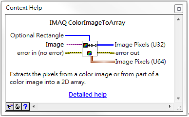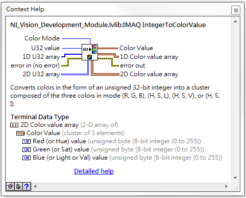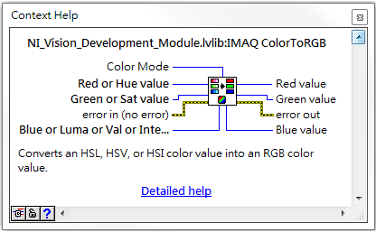 另外再特别介绍两个function,IMAQ ColorToRGB(下图3-12)这个function可以将其他影像空间的值转换成RGB的值;IMAQ ImageToColorValue(下图3-13)这个function则可以将RGB的值转换为其他影像空间的值。