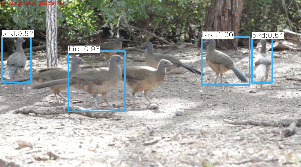 最后,经过非最大抑制后,得到了边界框。我们把边界框在输入帧上画出,并标出种类名和置信值。