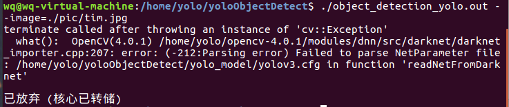 实验环境:ubuntu+opencv4.0.1+darknet+模型(yolov3.cfg yolov3.weights coco.names )