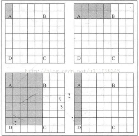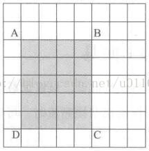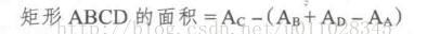 上图中的左上部分,着色像素表示左上角与点A之间的区域。这个区域用AA表示,剩下的图用AB、AC、AD表示。若想计算上图ABCD区域,将使用下列公式: