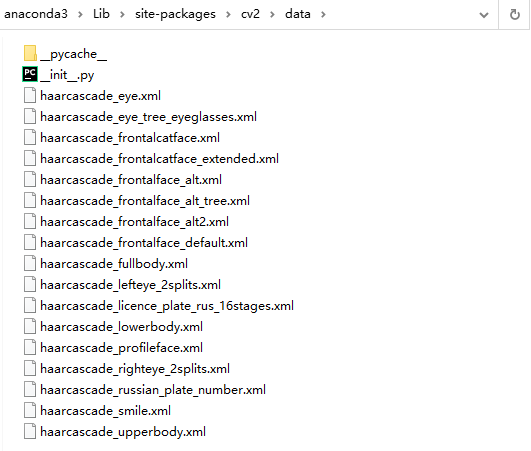 方法1:从 OpenCV4 源代码中找到 data/haarcascades 的子文件夹,子文件夹内包括以下文件: