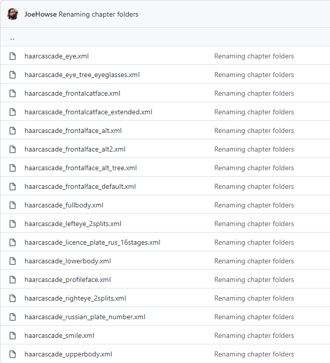 方法2:访问githubLearning-OpenCV-4-Computer-Vision-with-Python-Third-Edition/chapter05/cascades at master · PacktPublishing/Learning-OpenCV-4-Computer-Vision-with-Python-Third-Edition · GitHubLearning OpenCV 4 Computer Vision with Python 3 – Third Edition, published by Packt - Learning-OpenCV-4-Computer-Vision-with-Python-Third-Edition/chapter05/cascades at master · PacktPublishing/Learning-OpenCV-4-Computer-Vision-with-Python-Third-Edition