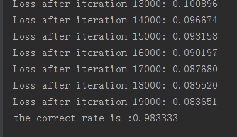 print "Loss after iteration %i: %f" %(i,calculate_loss(train_X,train_y))