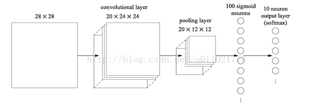 最后的两列小圆球就是两个全连接层,在最后一层卷积结束后,进行了最后一次池化,输出了20个12*12的图像,然后通过了一个全连接层变成了1*100的向量。