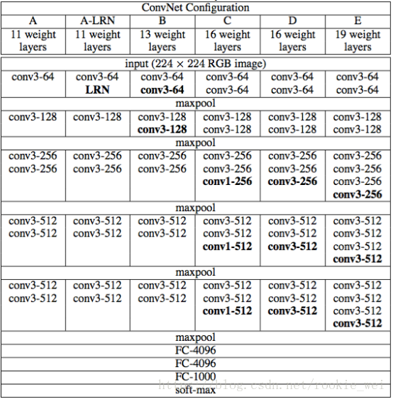 VGGNet将ImageNet的错误率降低到了7%。上图展示了VGG16的网络结构图,原始论文中,作者训练了6个网络,分别命名为VGG-A, VGG-A-LRN, VGG-B, VGG-C, VGG-D, VGG-E,其网络结构如下图所示,