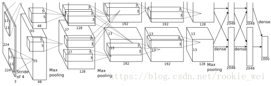 该网络由上下两部分组成,输入的图像经过5层卷积层,卷积核大小依次是11×11,5×5和3个3×3,这些卷积层后面跟着池化层。5个卷积层后连接3层全连接层。