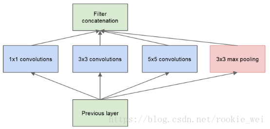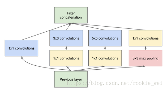 GoogLeNet模型由Google公司提出,该模型将ImageNet的错误率降到6%,它的创新在于提出了”Inception”结构,这是一种网中网结构,它把原来的单个节点拆成一个神经网络,一个Inception结构如下图所示,