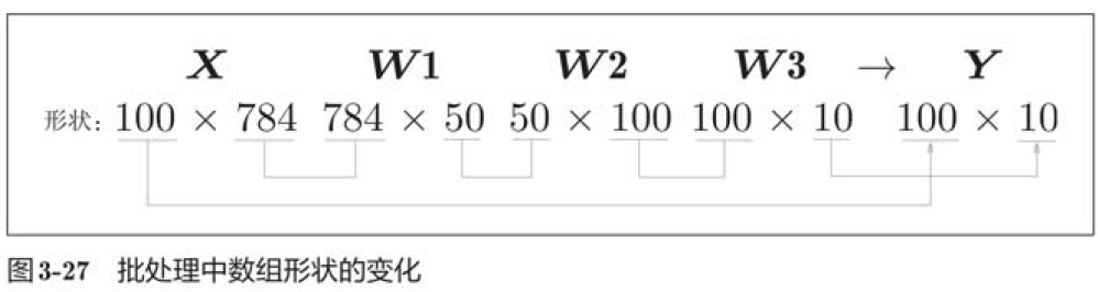 从整体的处理流程来看,上图中,输入一个由784个元素(原本是一个28*28的二维数组)构成的一维数组后,输出一个有10个元素的一维数组,这是只输入一张图像数据时的处理流程。