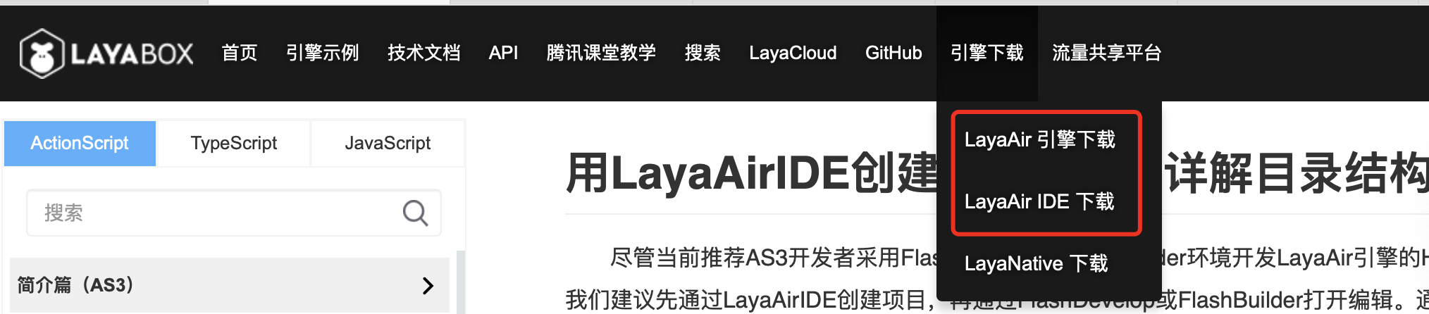 先登录laya官方网站,下载引擎和IDE,如图,把红框内的LayaAir引擎和LayaIDE都下载下来,在桌面创建新的文件夹layaair(可以叫别人名字,但是要记住名字),把下载的引擎和IDE拖到layaair文件夹。然后下载安装Chrome浏览器, 当执行AS3代码编译后,默认调用Chrome浏览器打开运行项目,需要安装此浏览器进行项目调试