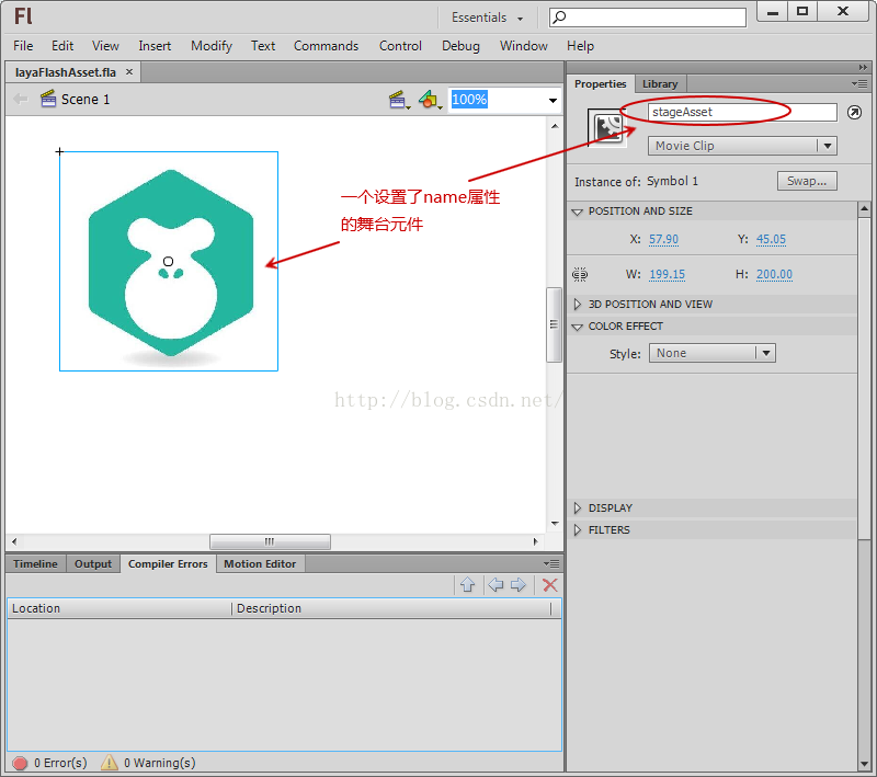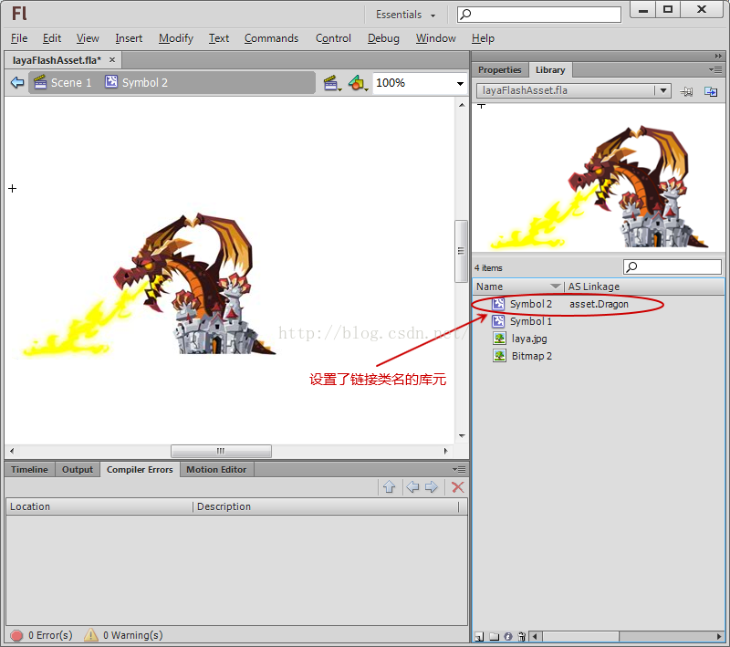 首先打开Flash CS6制作两个影片剪辑元件,其中一个放置在舞台上,命名为“stageAsset”,另一个影片剪辑原件添加链接类“asset.Dragon”:
