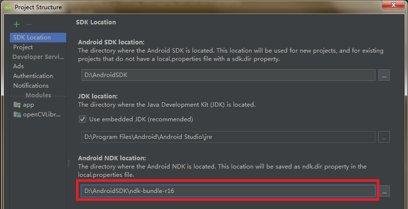 下载r16 ,并解压你的sdk目录,通过选择File->project structure...->SDK Location 更改ndk目录: