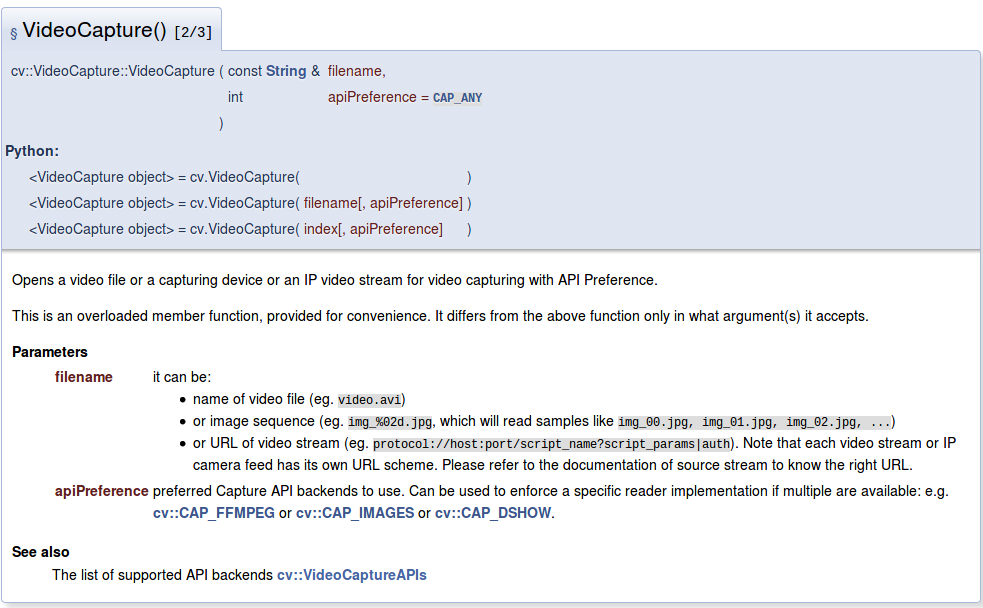 首先来一张OpenCV关于VideoCapure的介绍,说明很清楚,能够用来读取.avi视频文件,.jpg格式的图片序列,以及网络摄像头。