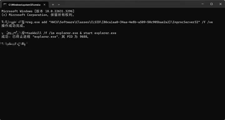 reg.exe add "HKCU\Software\Classes\CLSID\{86ca1aa0-34aa-4e8b-a509-50c905bae2a2}\InprocServer32" /f /ve3. 输入命令二:重启资源管理器,使之生效