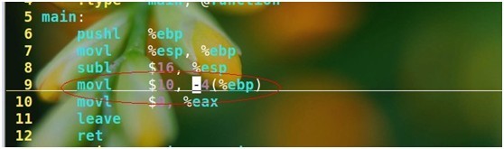 图中程序定义了一个整型局部变量i,并且被初始化为10,其中i是变量,10是常量,但是编译器并不将10放入常量区,而是在指令中直接通过立即数赋值(图1-2)。