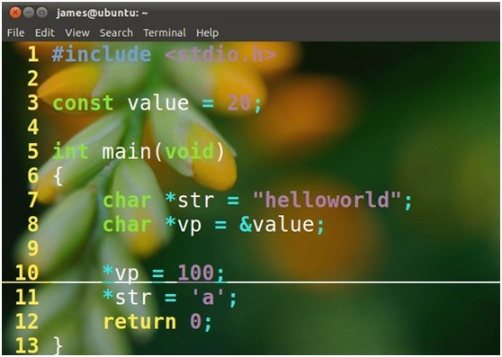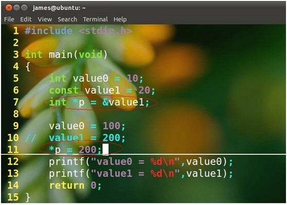 由于定义的指针变量p和表达式&value1的类型不匹配(p是int *,而&value1的类型是const int *)所以在第7行赋值的时候编译器会产生一个类型不匹配的警告,我们忽略该警告继续运行,结果改变了value1的值。