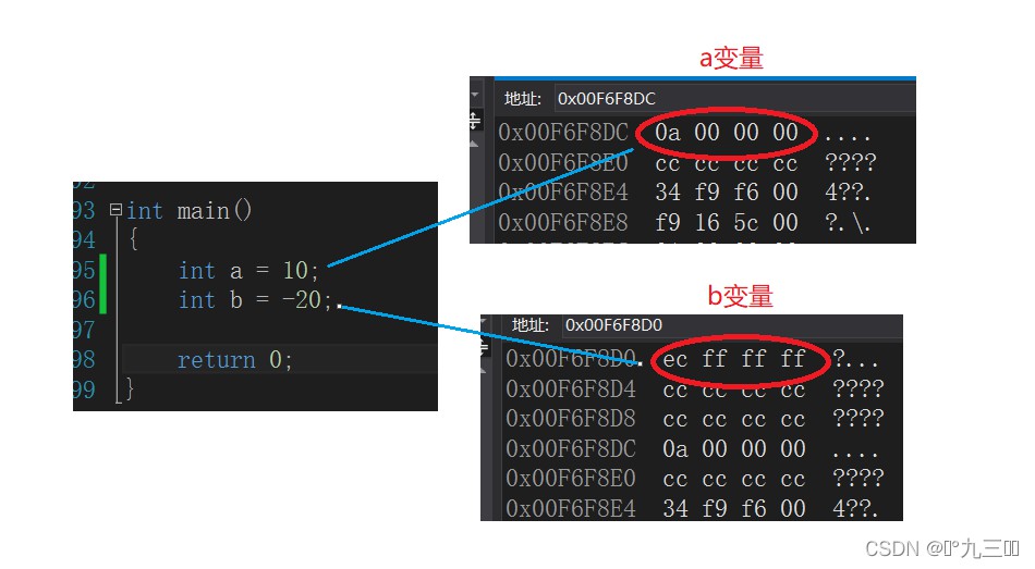 我们会看到a,b存储的是补码,但是字节的顺序有点有对,这就是整形数据存储的大小端问题,也叫字节序问题