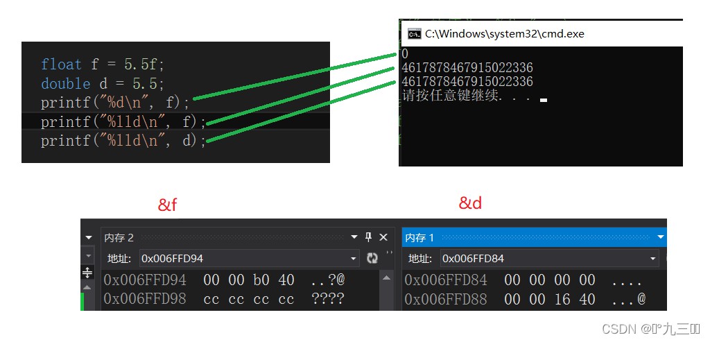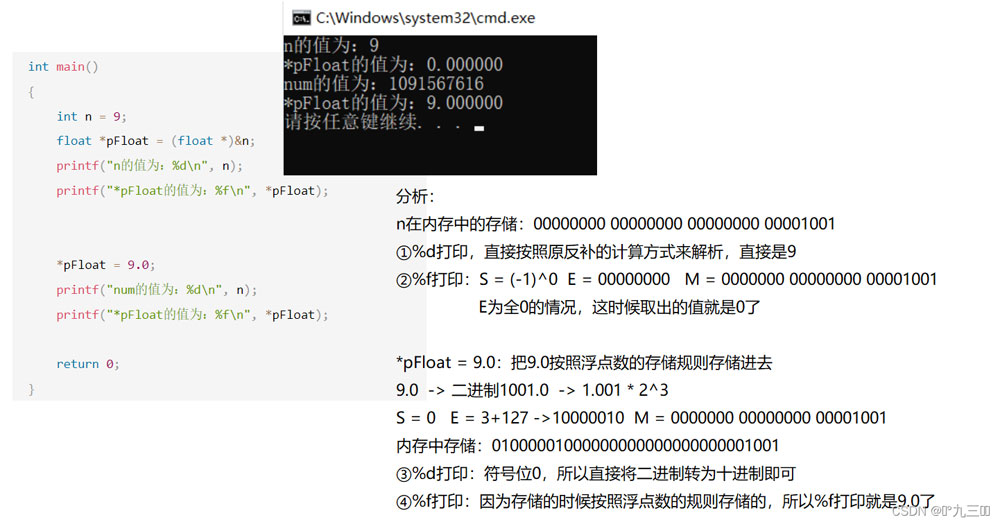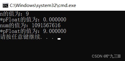 int main() { int n = 9; float *pFloat = (float *)&n; printf("n的值为:%dn", n); printf("*pFloat的值为:%fn", *pFloat);*pFloat = 9.0; printf("num的值为:%dn", n); printf("*pFloat的值为:%fn", *pFloat); return 0;
