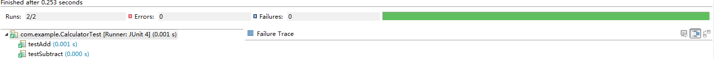 测试完成后,如果JUnit视图尚未打开,Eclipse将打开它。如果单元测试成功完成后,将会在JUnit视图中看到一个绿色条: