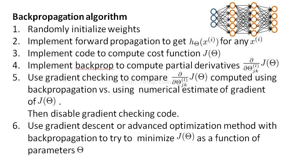 代价函数J(Θ)、反向传播、梯度检验、随机初始化、自动驾驶