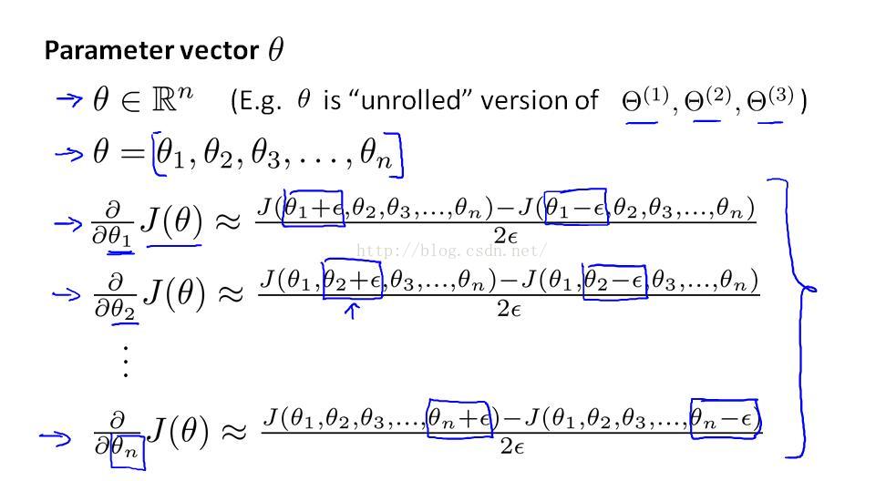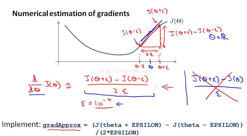所谓的梯度检验,就是用数值计算的方法得到近似估计的偏导数,与反向传播的偏导数比较,如果误差足够的小就确保梯度下降正常工作。