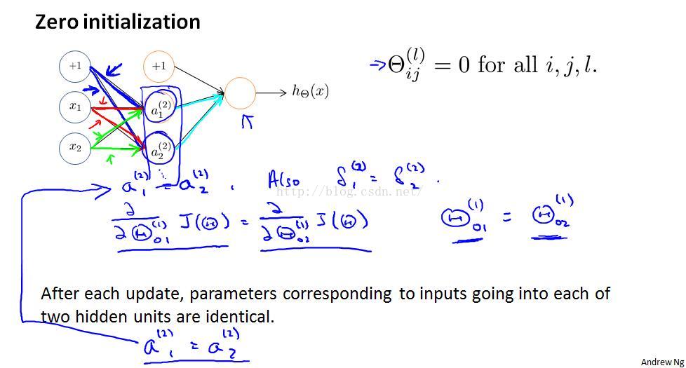 在逻辑回归、线性回归里,我们在使用梯度下降算法之前,传入的参数θ都是零向量,然而在神经网络里并不适用,因为通过一系列运算你会发现,如果所有层与层传递参数Θ初始化为0,计算结果是同一层每个单元向下层传递的参数都相同,造成高度冗余,这并不是我们最终想看到的结果,解决的办法就是random initialization.